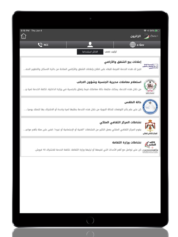 يمكن لمستخدم التطبيق، تصفح فئات مختلفة مثل "مركز الاتصال الوطني، الأماكن السياحية، حسابي، الدليل، اسأل الحكومة"