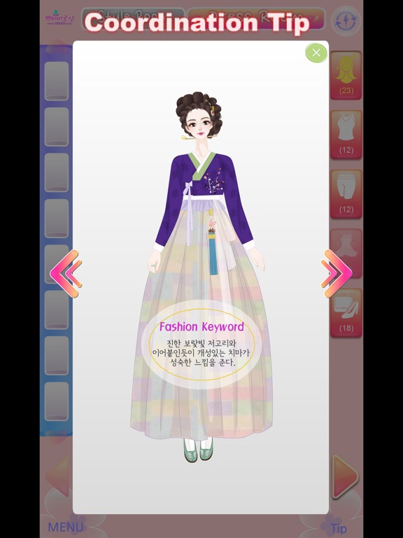 상큼한 패션 로맨스 쁘띠마르샹에서 만든 드레스룸 패키지 다섯번째 앱 파트버전입니다. 패키지5도 패키지2와 마찬가지로 한국의 전통옷인 한복을 주제로 시대별로 한복을 코디할 수 있게 드레스룸이 구성되어 있습니다.
