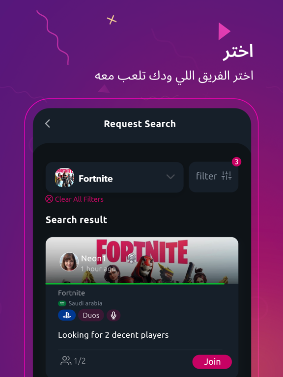 • ابحث عن لاعبين مخصصين، أرسلهم طلبات او وافق على طلباتهم وابني فريقك المميز.