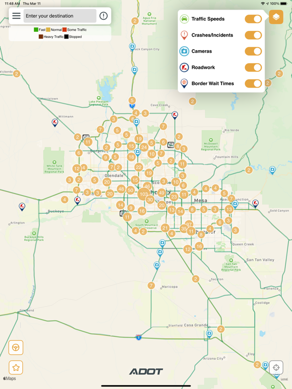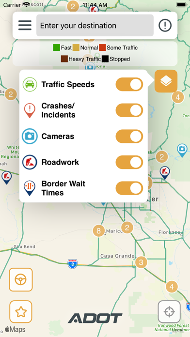 AZ511 works in conjunction with the Arizona Department of Transportation's AZ511.gov, the Arizona Traveler Information website, to provide the latest information on conditions along the state highway system. Users will receive information on delays, crashes, construction and closures, as well as alternate routes to help drivers avoid backups. Motorists may view ADOT’s statewide network of cameras on the app. Drivers can get real-time information on their routes by entering their destinations into the app. Travelers may also save regularly used routes and receive alerts along those routes.