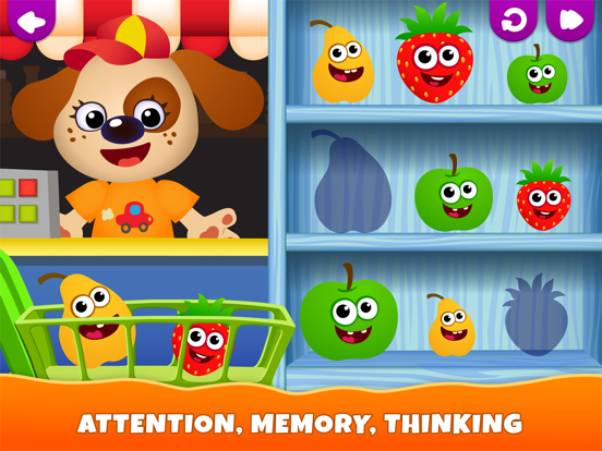 Attention – This section helps to develop and train your child’s memory, using various types of image recognition, focusing on attention to detail.