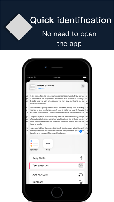 Text Extractor is a text recognition OCR software that extracts text information from pictures with high accuracy, it has fast scanning speed, high accuracy of text recognition, converts picture text into editable digital text content, any printed text or picture text or PDF can be scanned and recognized, and supports translation, editing, sharing, batch scanning, PDF file scanning, provides various pictures, bank cards, Business license, bills, ID cards, driver's licenses, driving licenses, license plates, handwritten text, etc. to take pictures to quickly identify the text and convert the translation, is a pocket scanner, portable document library management tools, it can greatly improve your office efficiency, is the most convenient and fast professional ocr picture to text application, hurry up and download!