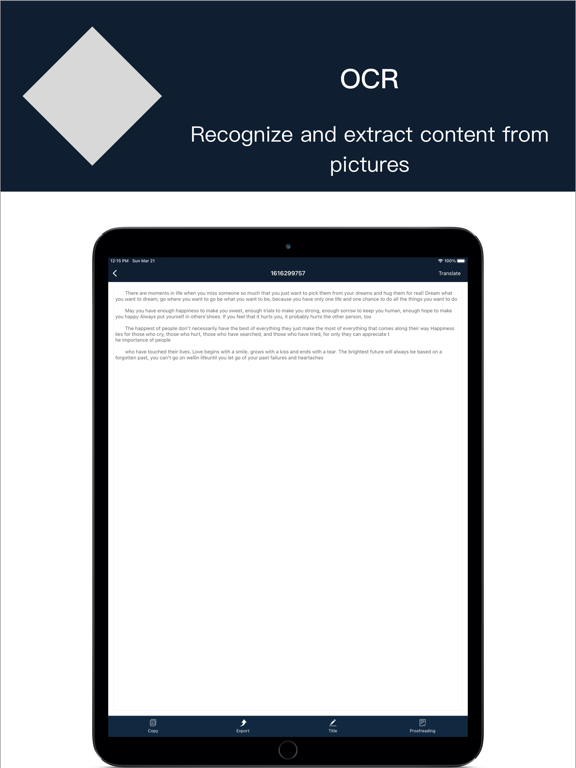* Scan various documents, pictures, books, etc. to extract the text you want and translate them.