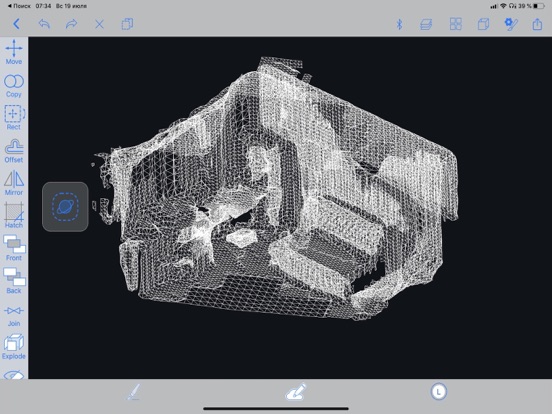 App saves the scan results as a point clouds or meshes. Сlouds can be exported to pts or ply format. Meshes can be classified as wall, ceiling, floor, door, window, table or seat. Classified objects are saved in separate layers into DWG file.