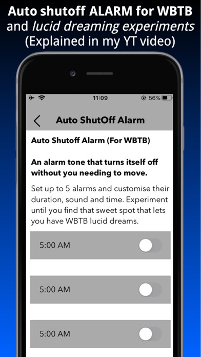 - Auto shut off alarm for WBTB (Set up to 5 alarms that turn themselves off, to help you lucid dream)