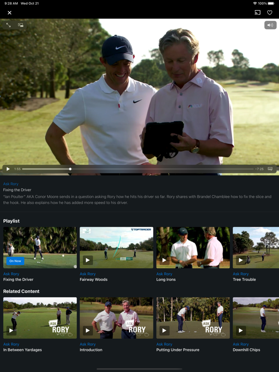 Keep the very best golf instruction close at hand, with thousands of on-demand golf tips and lessons from champion golfers like Rory McIlroy, as well as the same coaches who have helped major champions improve their game.