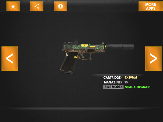 When you completely build your weapon you can take screenshot and share it with friends or via social networks. Whatever you choose in build options will be saved on your device so you do not have to worry about saving. In the options you can choose how to shoot with your gun, select slow or normal motion, chose unlimited ammo or the normal number of bullets within magazine. It’s the same for vibrations, smoke effects and screen rotation.