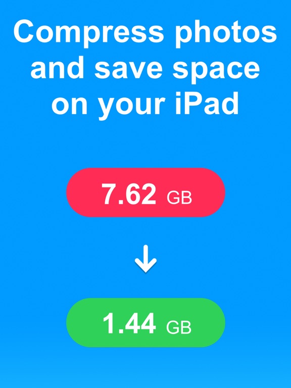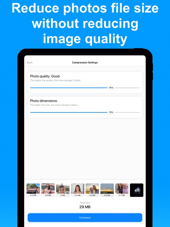 Use Compress Photos to shrink the file size of photos and regain storage space on your device. When applied to all your pictures, Compress Photos can help you store up to 10 times more photos on your iPhone or iPad.