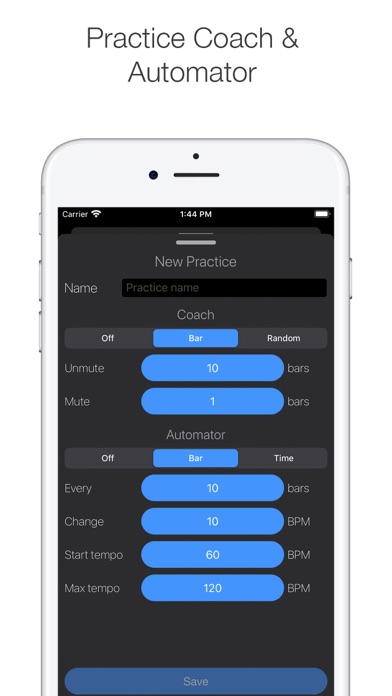 Poly Metronome includes a Coach Trainer which mutes a selected bar in the beat, allowing your brain to fill in the gap and thus train your innate sense of timing.