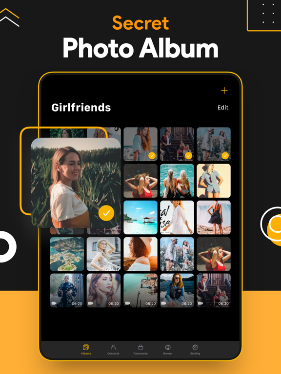 You can secure your secrecy and precious memories for yourself. Photo Vault app gives you a secret and safe place to store all your private photos, videos, passwords, contacts and internet browser information on.