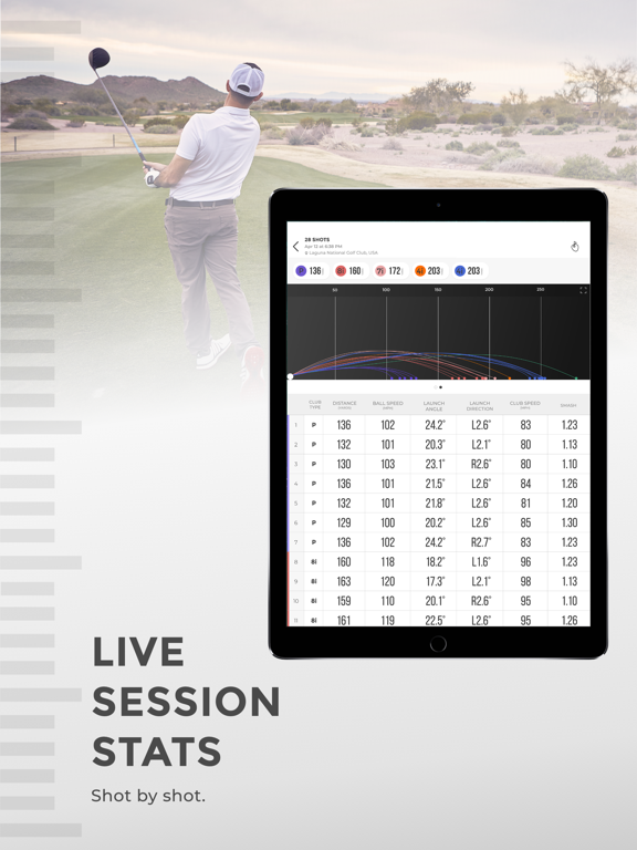- Shot Library: All your shots are collected to review stats over your lifetime using the Mobile Launch Monitor (MLM).
