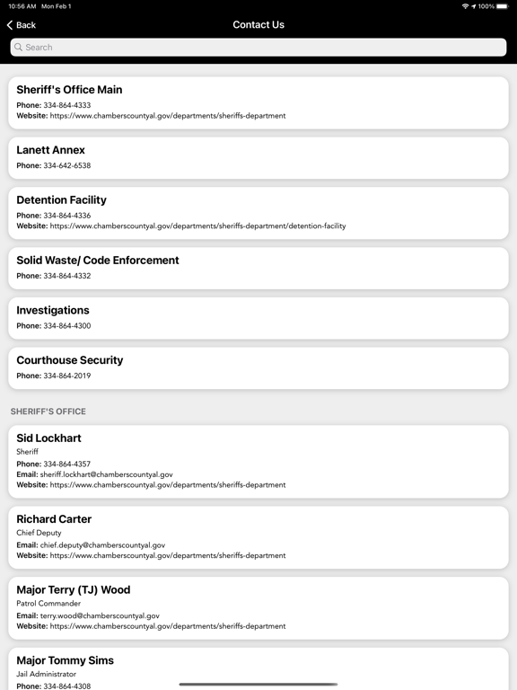 The Chambers County AL Sheriff’s Office mobile application is an interactive app developed to help improve communication with area residents. The Chambers County AL Sheriff's Office App allows residents to connect with the sheriff’s office by reporting crimes, submitting tips, and other interactive features, as well as providing the community the latest public safety news and information.