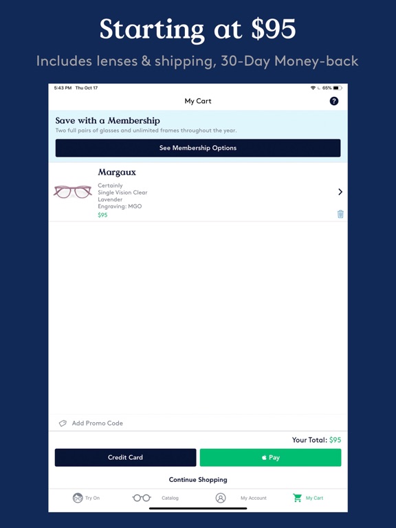 Starting at just $95 (lenses and shipping included) or choose a Membership plan for $185/year and never have to worry about losing, breaking, or growing out of your glasses again.