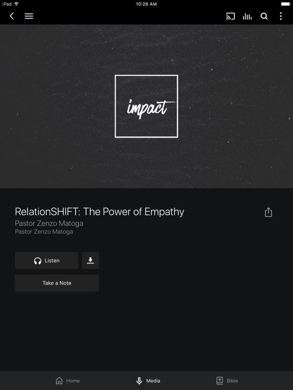 Access all the latest content from Impact Church and Pastor Zenzo Matoga. Connect to our online community and receive encouragement wherever you are. The Impact Church app makes it easy to: - Listen to all the latest sermons from Impact Church - Join iGroups - Connect with our community, ask for a prayer request - Discover ways to get involved at Impact Church