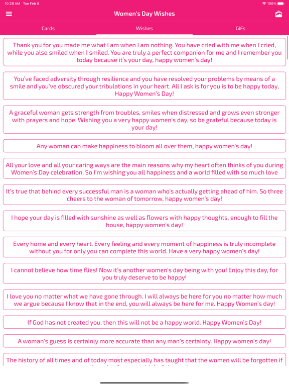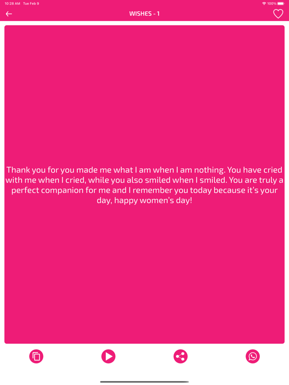 Happy Women's Day Wishes app have a collections of greetings and wishes. App allows you to send Women’s day wishes and greeting to all the wonderful / beautiful women’s in the world. You can sent amazing wishes to your friends, family, and everyone you love.