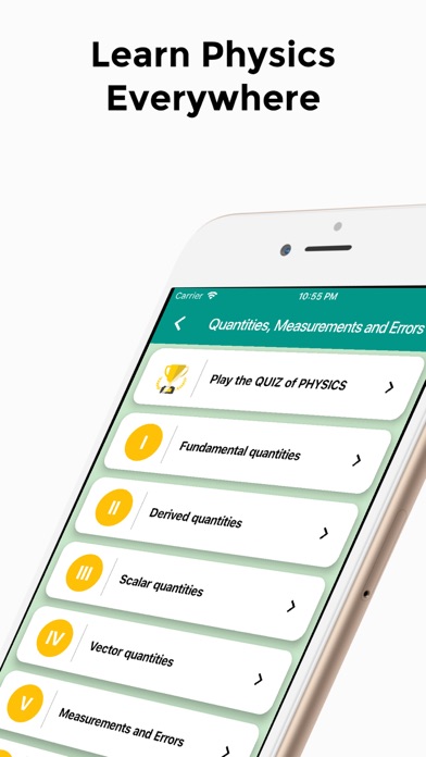 Questions about every topic in the app. Quizzes will help you learn physics while having fun.