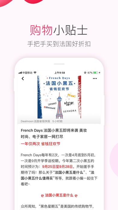 法国商家最新最热的折扣信息,24/7滚动更新。法国购物优惠资讯:女装、男装、鞋包、美妆、护肤、家居、母婴、零食、数码,超值优惠一网打尽! 法国省钱快报是找全球好物,分享优质生活的购物内容平台,是法国生活购物、海淘购物必备神器。集合了各大品牌商家折扣:大牌化妆品、护肤品等美妆折扣,包包鞋子潮服等时尚类折扣,美食零食、家居厨卫、电器、电子电脑、汽车旅游、影视演出等生活类折扣和优惠信息。 法国省钱快报提供华人最爱的购物生活信息分享:美妆护肤和时尚购物心得和晒货、法国最受欢迎美食零食推荐,旅游、移民、运动保健、母婴护理、教育、汽车和出行、数码、电子电脑和海淘等各类指南干货文章。关于法国生活衣食住行用、方方面面的实用信息都能在这里找到。