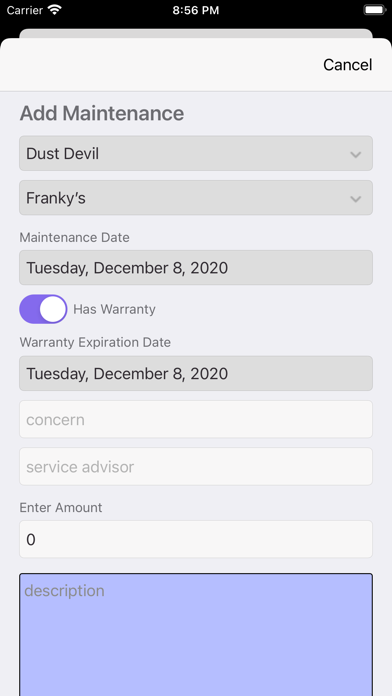 Keep track of every maintenance that has been done on your vehicles. When you take your vehicle to the shop, you want to track when and what has been done on your vehicle such as maintenance date, new parts, engine work, warranties, service advisor, etc.