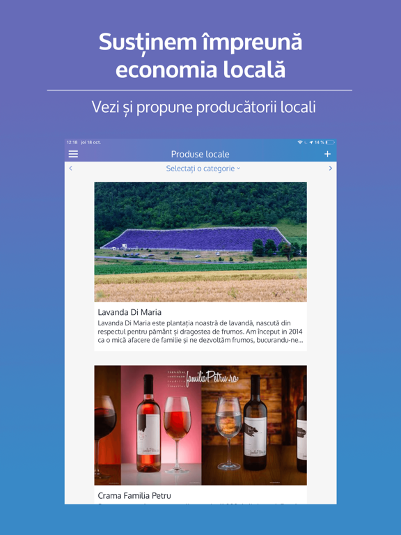 - Susține economia locală, poți contacta direct din aplicație producătorii locali sau poți să te listezi dacă ești unul dintre ei.
