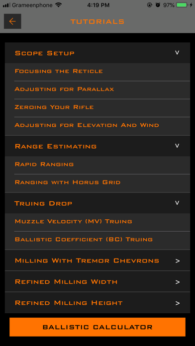 Ballistics Solver for long range shooting, provides accurate solutions through an easy to use interface. Includes HORUS Reticle tutorials, Ballistic Coefficient (BC) and Muzzle Velocity (MV) Truing, and automatic TREMOR reticle wind dot calibration functions. Bluetooth capable to HORUS LRFs & Weather Meters.