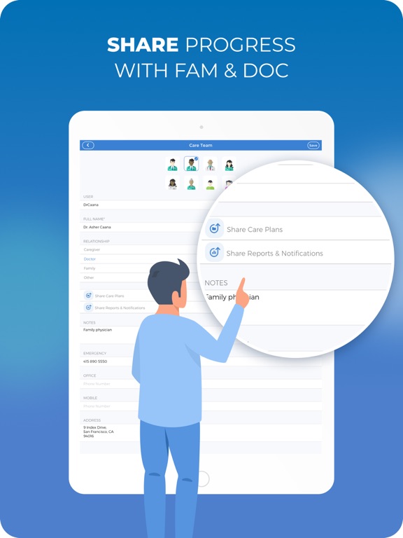 Add your care team to the app to let them monitor your progress remotely, or monitor the health and well being of your loved ones!