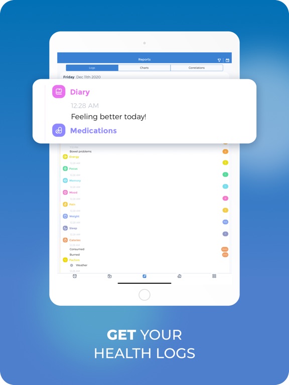 Track vitamins, supplements, iron, birth control, chronic conditions, medication, symptoms, nutrition, activity, daily vitals, therapies, pregnancy, baby symptoms, notes & automatically discover correlations & triggers through reports.