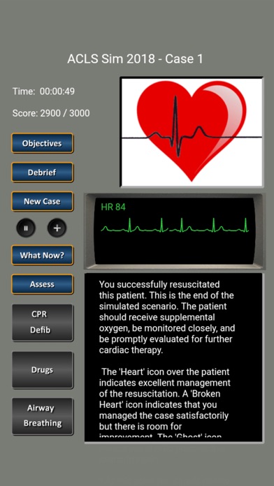 In addition to providing a graphical and dynamically changing simulation, the app provides a detailed record of your resuscitation, scores your performance, and provides detailed feedback on your management. Thus it is a complete learning environment.