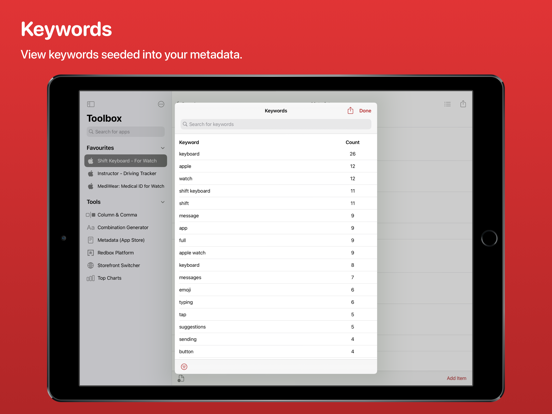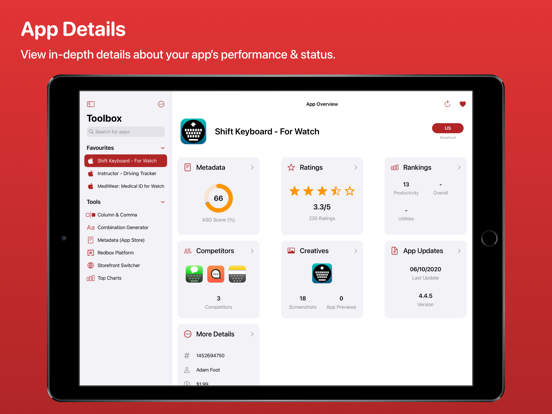 The Toolbox is the perfect app for iOS Developers. It provides you with the tools required to create, test and analyse your metadata so you can improve your performance on the App Store.