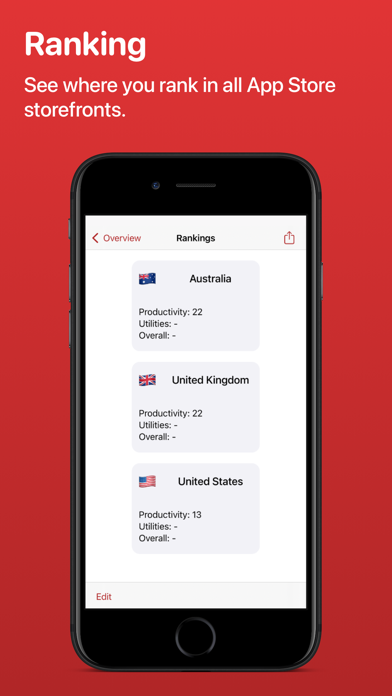 Rankings: See where your app ranks in any storefront around the world. Add competitors to see how they compare.