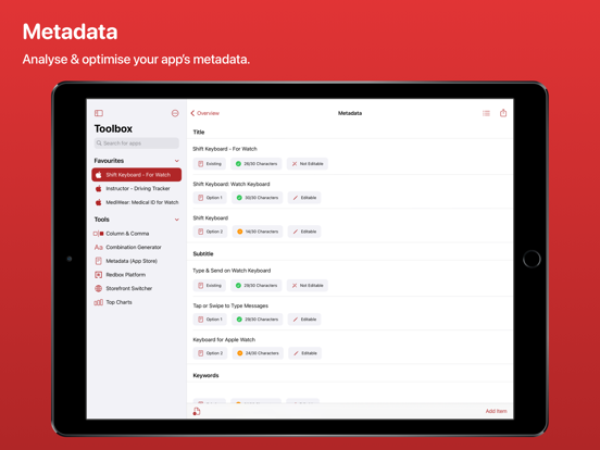 Redbox Toolbox has been developed by Redbox Mobile - an ASO company with 7+ years of extensive experience optimising app metadata for global brands. We’ve made the Toolbox completely free to download and use across iOS, iPadOS, macOS and watchOS!