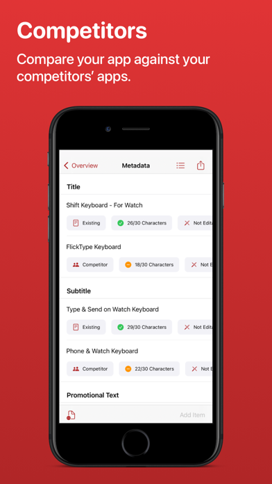 Competitors: Add competitors to your app that you’d like to compare metadata or rankings against.