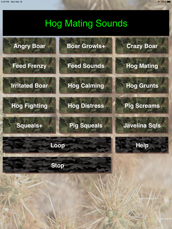 Download this app to help you have success in calling in wild hogs. Field proven calling sounds drives them crazy. Unlike other hog calling apps on the market, this one was designed with you, the hunter in mind. Everything is on one screen. When you're out in cold weather, the last thing you want to be doing is navigating through many screens to get to the sounds and controls. This app solves that problem.