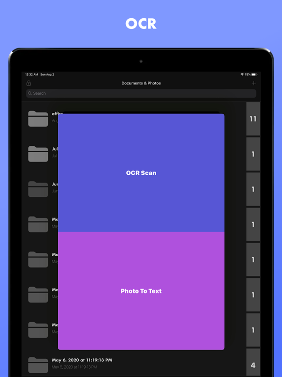 We have all the features you need from scanning multiple documents and photos and save it locally securely with a password Touch ID or Face ID.