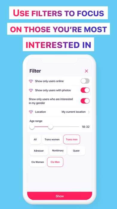 Whether you are trans, non-binary, or cis, our LGBTQ inclusive app allows you to be yourself, so you can share your story and feel comfortable getting to know other members on Fiorry. The platform offers a warm, welcoming community where users can find a partner, a friend, or a date. We embrace the full spectrum of gender diversity: from trans, nonbinary, genderfluid, genderqueer, gender-nonconforming and intersex people to their cisgender allies. All gender expressions are invited to join.