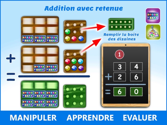 Des outils pour manipuler et comprendre : la manipulation des objets interactifs et ludiques comme Badix (Numération en base dix), permet à l’enfant de comprendre les additions et les soustractions…