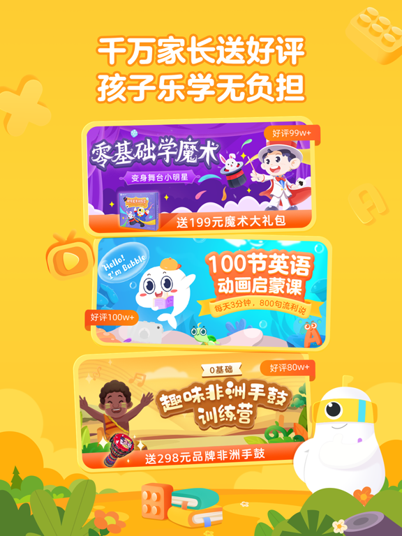 覆盖3大趣味学科,数学推理、英语音标、乐器启蒙,应有尽有。萌趣IP陪读,精彩好玩,让孩子爱上学习,家长省心省力