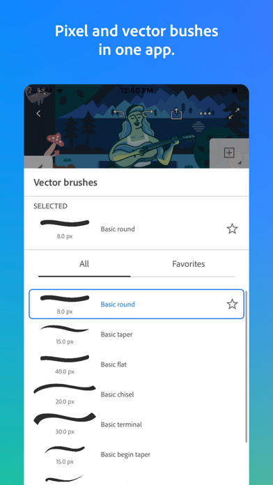 Adobe Fresco combines the power of your favorite Photoshop brushes with the precision of vector brushes and the revolutionary technology of Live Brushes, for unlimited expression. Paint with watercolors and oils that blossom, blend, smear, and smudge just like the real thing. Work with infinitely scalable vector brushes to create crisp lines, ready to print at any size. With the premium version, you can also easily import all your Photoshop brushes, or choose from over a thousand natural brushes created by celebrated master Kyle T. Webster.