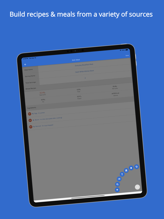 - Add meals to your daily log and see a calculated breakdown of how many calories, carbs, fats, and proteins you have remaining for the day.
