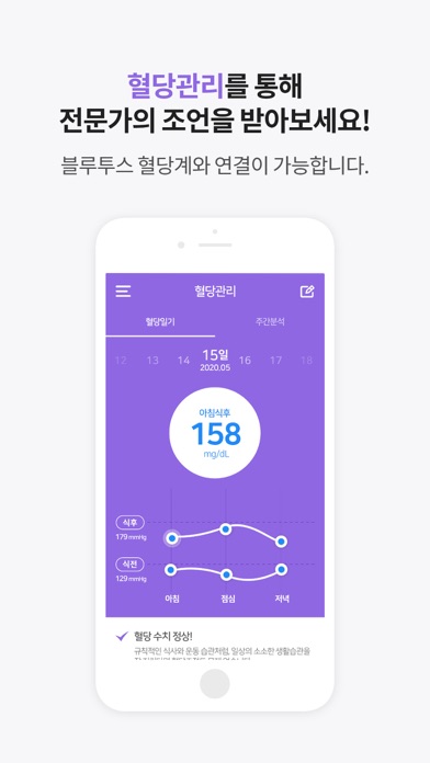 • 혈당관리: 직접 또는 블루투스 혈당계를 통해 혈당일기를 작성하고 관리할 수 있습니다.