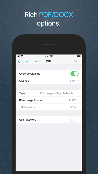 • Advanced PDF options: password protected PDF, efficient compression formats