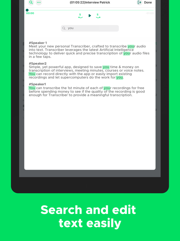 - Unique in-app editor to edit the transcript in the app