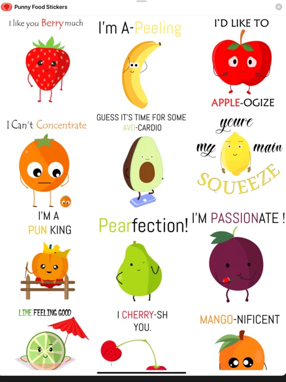 Very punny animated food puns stickers for iMessage texts. Currently, we have funny punny fruit pack. More variety of food coming soon like vegetable, plants, fast food, desserts, and more!