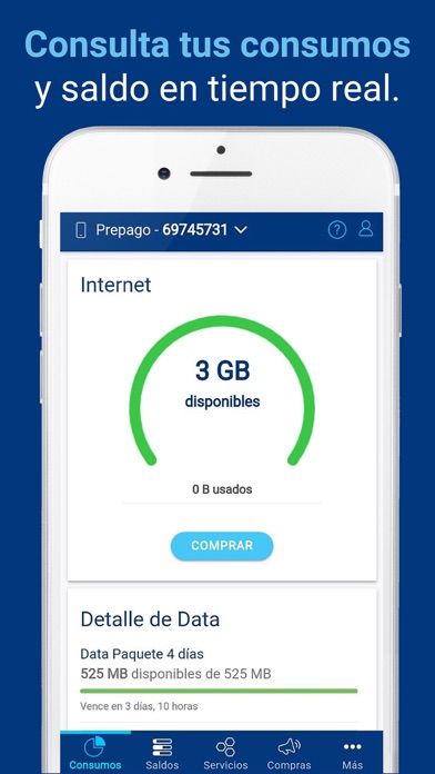 • Compra y activa otros servicios: Adquiere paquetes de data adicionales, minutos, SMS, Roaming y servicio Premium desde tu app.