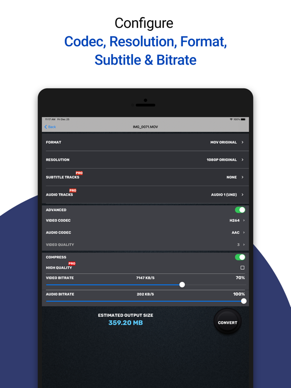 • Video Converter: Convert and Compress your video to almost any video and audio formats. Configuration options: