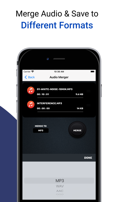- Merge almost any format Audios to any other format. We support MP3, M4A(AAC), M4B(AAC), AC3, WAV, OGG, FLAC files as input and output format.