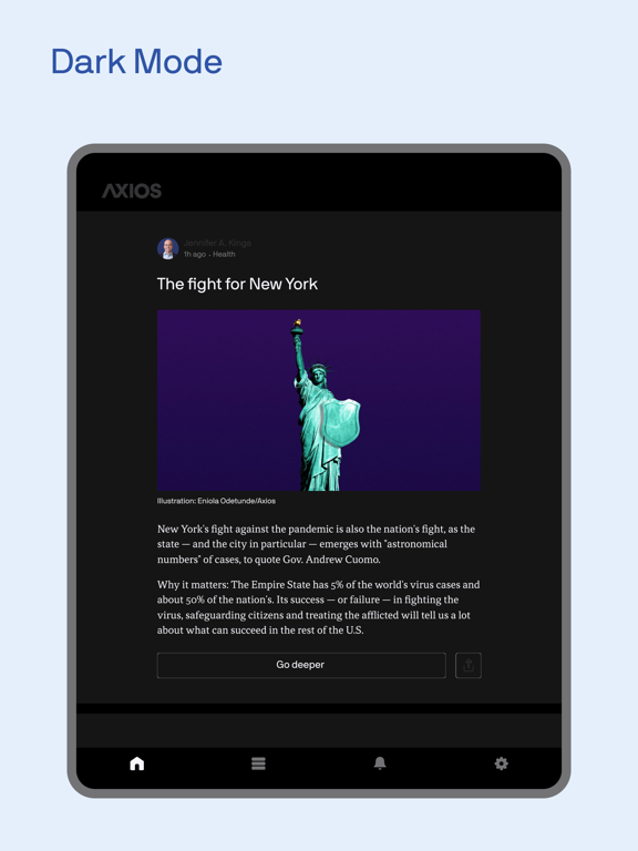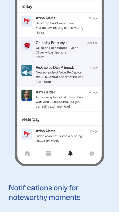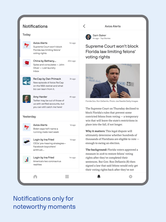 Our app provides a clean reading experience that puts the news you care about front and center. You start by following specific channels that correspond to topics that interest you. You can then access relevant content either in a single integrated feed or by hopping from channel to channel. And to make sure you stay on top of the news, Axios journalists will send you helpful notifications only for noteworthy moments.