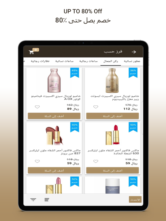 مجموعة متنوعة من المنتجات من أفضل العلامات التجارية في جميع الفئات مثل لعطور والأزياء الرجالية والنسائية ومنتجات الصحة والجمال والحقائب والاحذية والنظارات وغيرها.