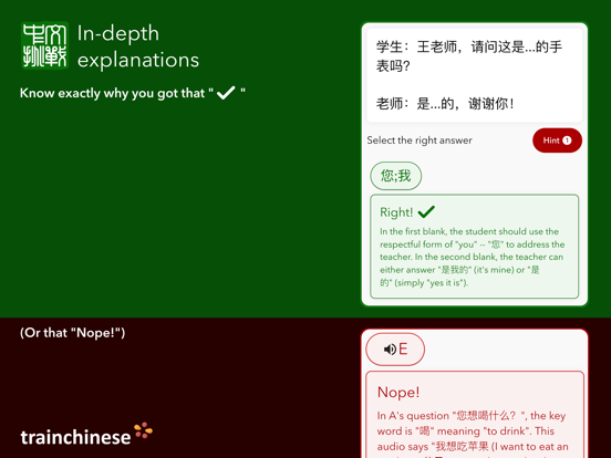 Plenty of apps can throw questions at you, but rarely is there any context. Rather than forcing you to guess why your answers were right or wrong, Chinese Challenges features detailed explanations written by our native-speaker experts.