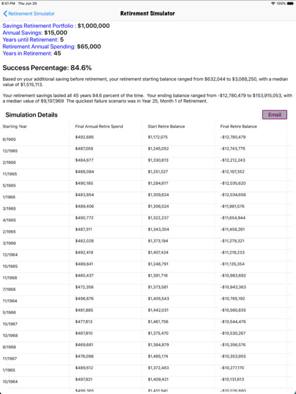Disclaimer: The information & calculations in this Retirement Investing Calculator Simulator are for educational purposes only, and do not constitute financial advice. Contact a licensed financial planner for specific retirement advice and for making retirement financial decisions. All data points included are correct to the best of our knowledge, but no warranty is made regarding the accuracy or applicability of this data or calculations. The owners / authors of this application (including Workman Consulting LLC) hereby disclaim all responsibility for any use / misuse of this application and the data provided by this application. The authors of this app do not give any warranty as to the accuracy, reliability or completeness of information; and do not accept any liability for any error or omission on this app or for any resulting loss or damage suffered by the recipient or any other person. By downloading and/or using the application, you agree to these terms. Past returns are not indicative of future performance. Even if a retirement investing financial strategy would’ve survived 100% of past simulation scenarios, it does not guarantee that it will do so in the future.