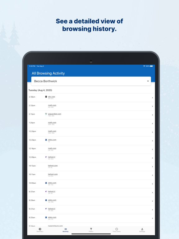 See which websites, apps, and extensions your child uses. Gain internet controls for school-issued devices at home. Also, if your child’s school uses GoGuardian Teacher, see how often teachers have issued intervention commands, like locking screens or closing tabs.